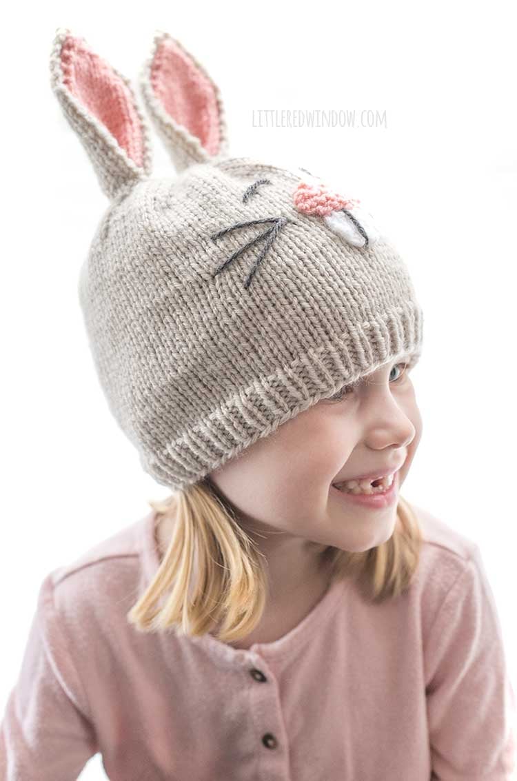 This adorable Funny Bunny Hat knitting pattern is the newest of my Bunny related knitting patterns and this one has all the cute details you want in an animal hat knitting pattern. From the cute pink-lined bunny ears on top, to the pink nose and white bunny teeth. The instructions even explain how to add a fluffy white pom pom bunny tail on the back of the hat (optional and not suggested for younger babies)