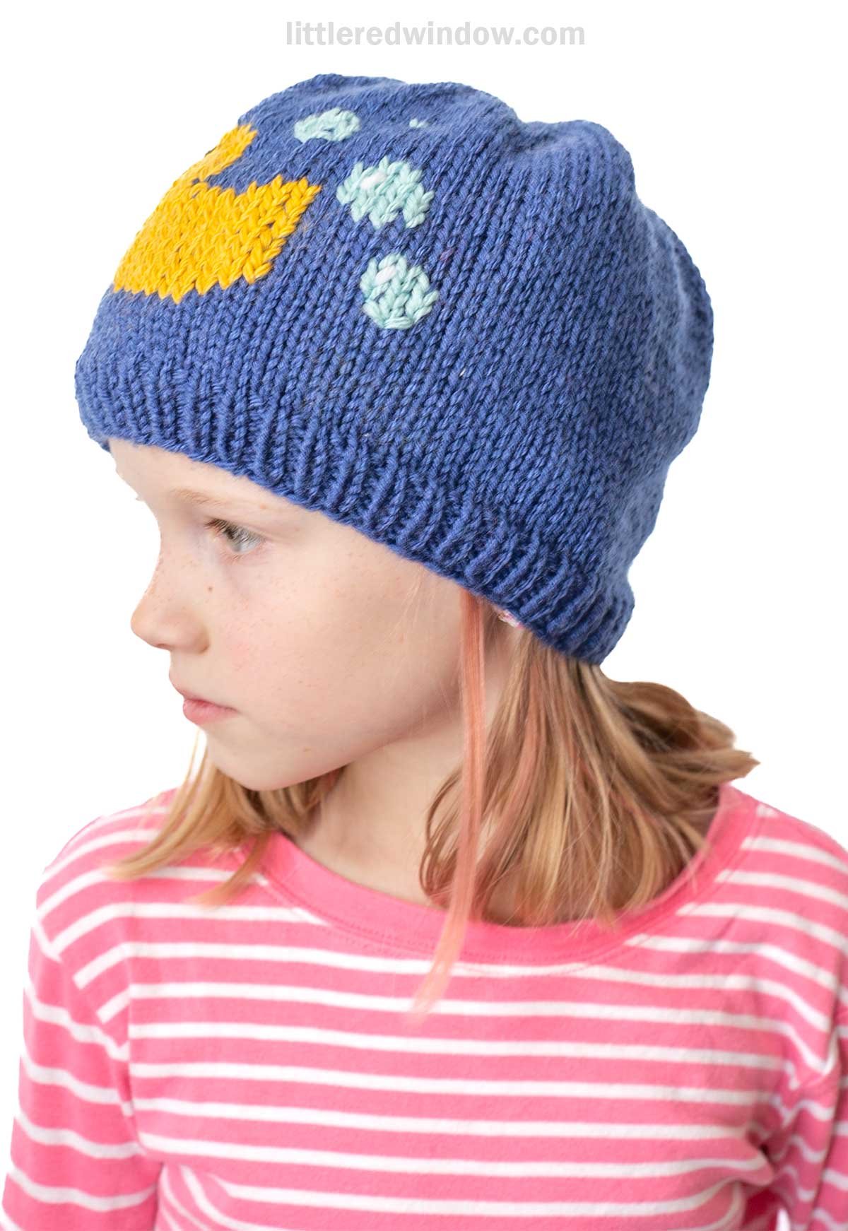 This adorable rubber duck hat knitting pattern is the perfect easy knitting pattern for anyone in your life who loves ducks! This easy hat knitting pattern is knit in the round, with worsted weight yarn and the cute yellow rubber duck and fun bathtime bubbles are added at the end with duplicate stitch.