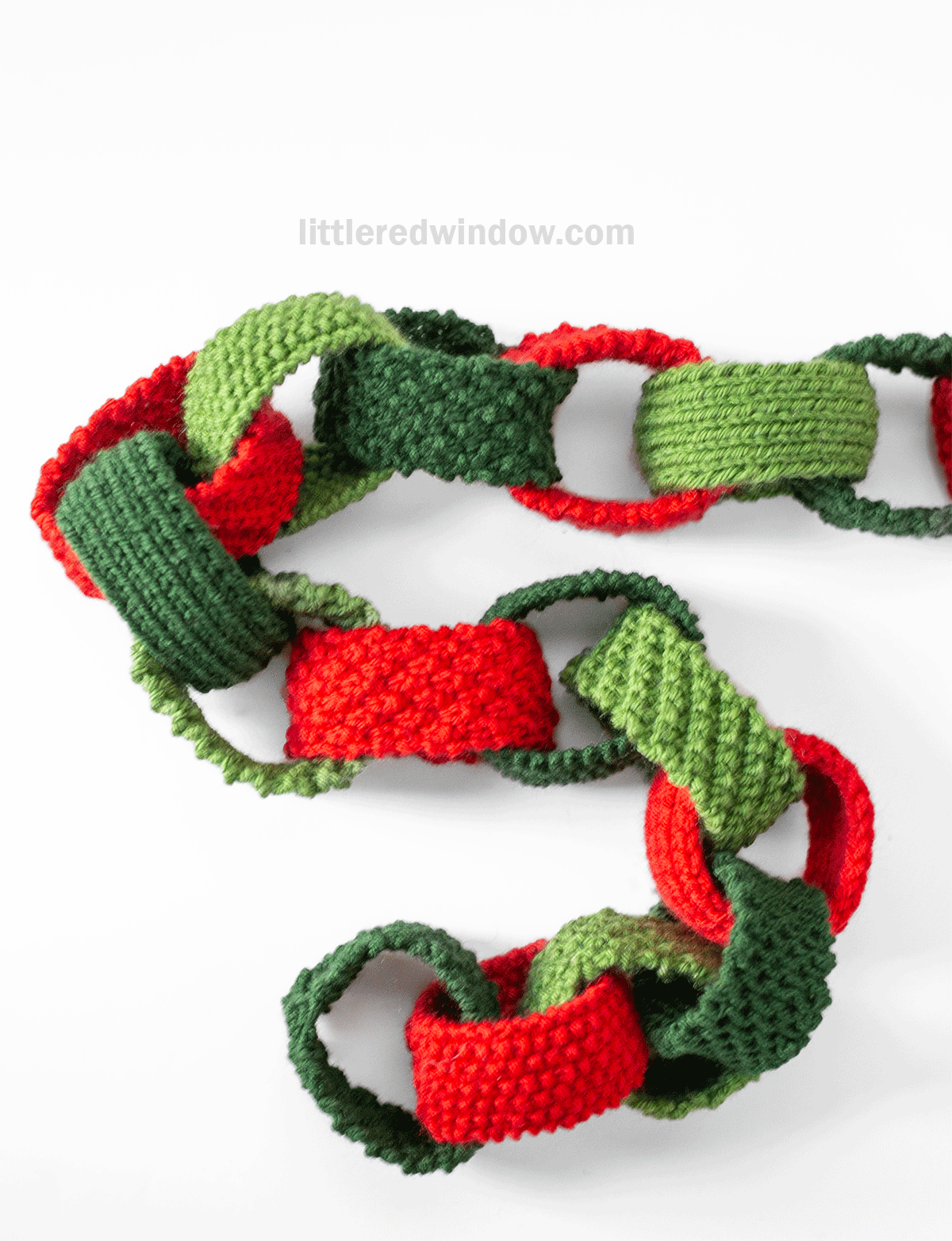 This gorgeous Christmas paper chain knitting pattern, will make a beautiful holiday decoration for years to come. While not actually made of paper, this pretty knit chain is full of color and texture and is truly fun to knit. You can combine any of the 5 stitch patterns with any colors of your choice for almost endless customization. Whether you think of it as a knit paper chain or a Christmas garland knitting pattern, you don't want to miss out on this one!
