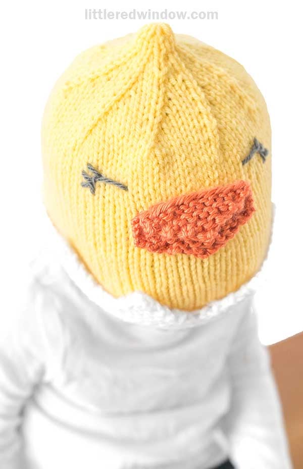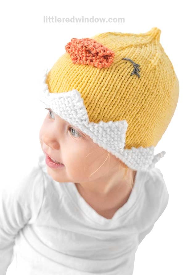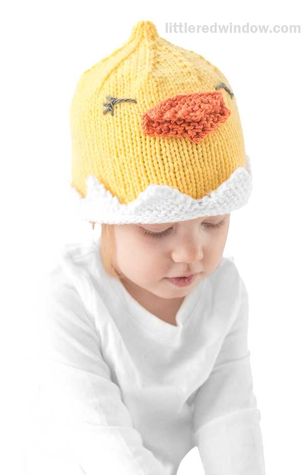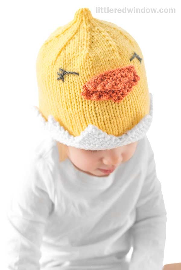 Spring is the perfect time for a cute little chick hat (or you can call it a duckling hat if you prefer). This little chick hat with its cute little point on top and adorable beak is an easy knit and a great intro to my patterns, perfect for a knitting pattern beginner who knows how to knit in the round. And the best part, no incubator required to hatch your little chick hat!