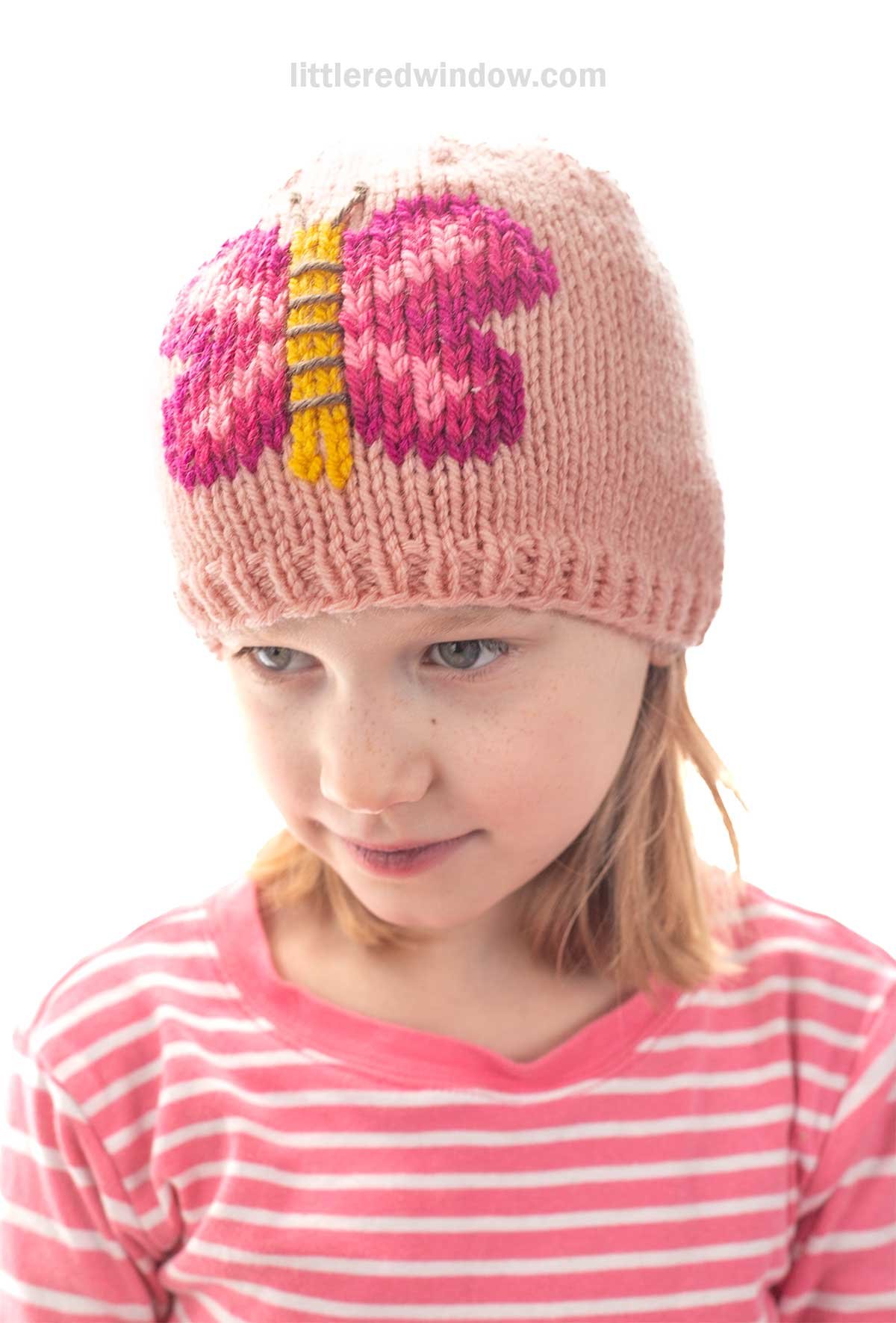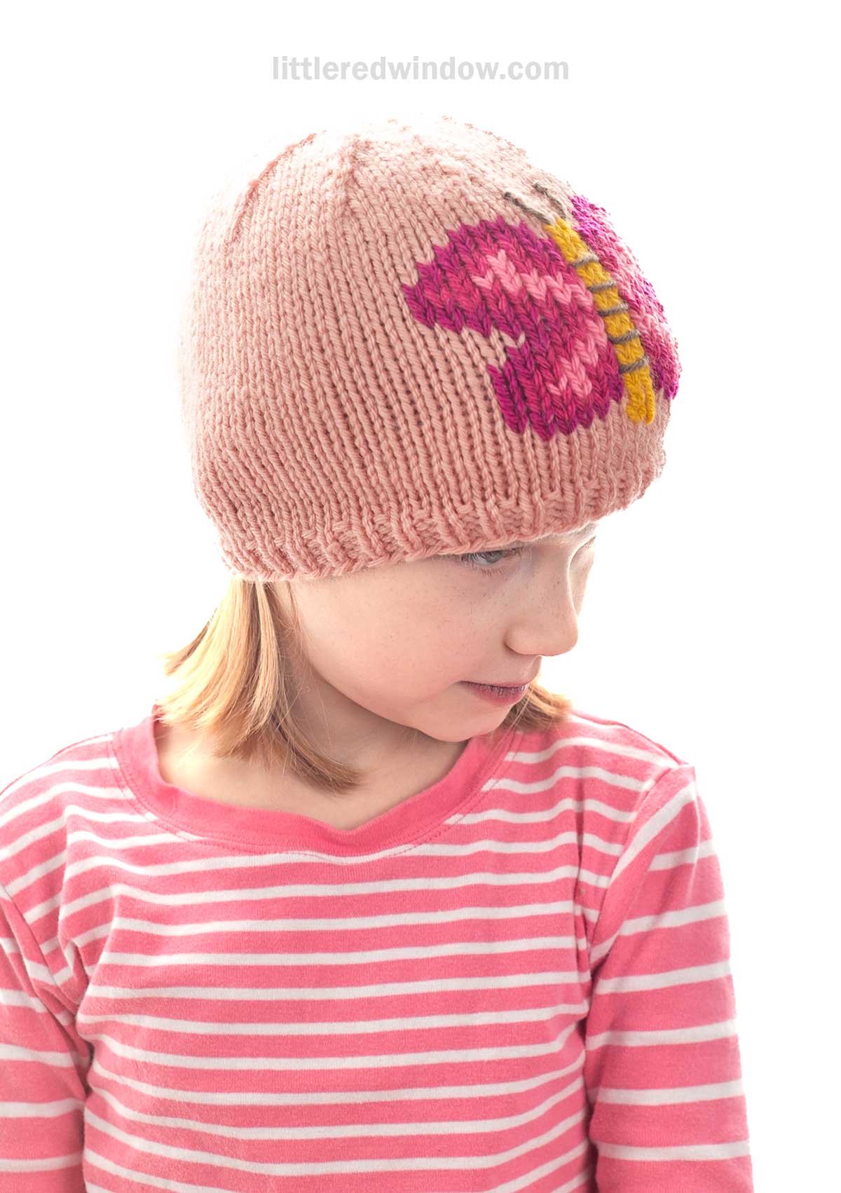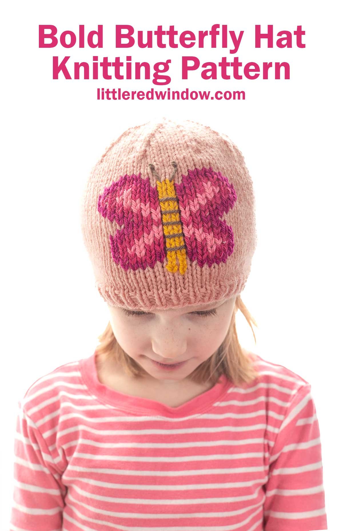 This adorable Bold Butterfly Hat knitting pattern is a quick and easy knit and can be made in any of six sizes from newborn to toddler to adult. The bold butterfly hat patter is knit in the round with worsted weight yarn and then the butterfly motif is added at the end with duplicate stitch. Check out littleredwindow.com if you need a duplicate stitch tutorial or refresher!